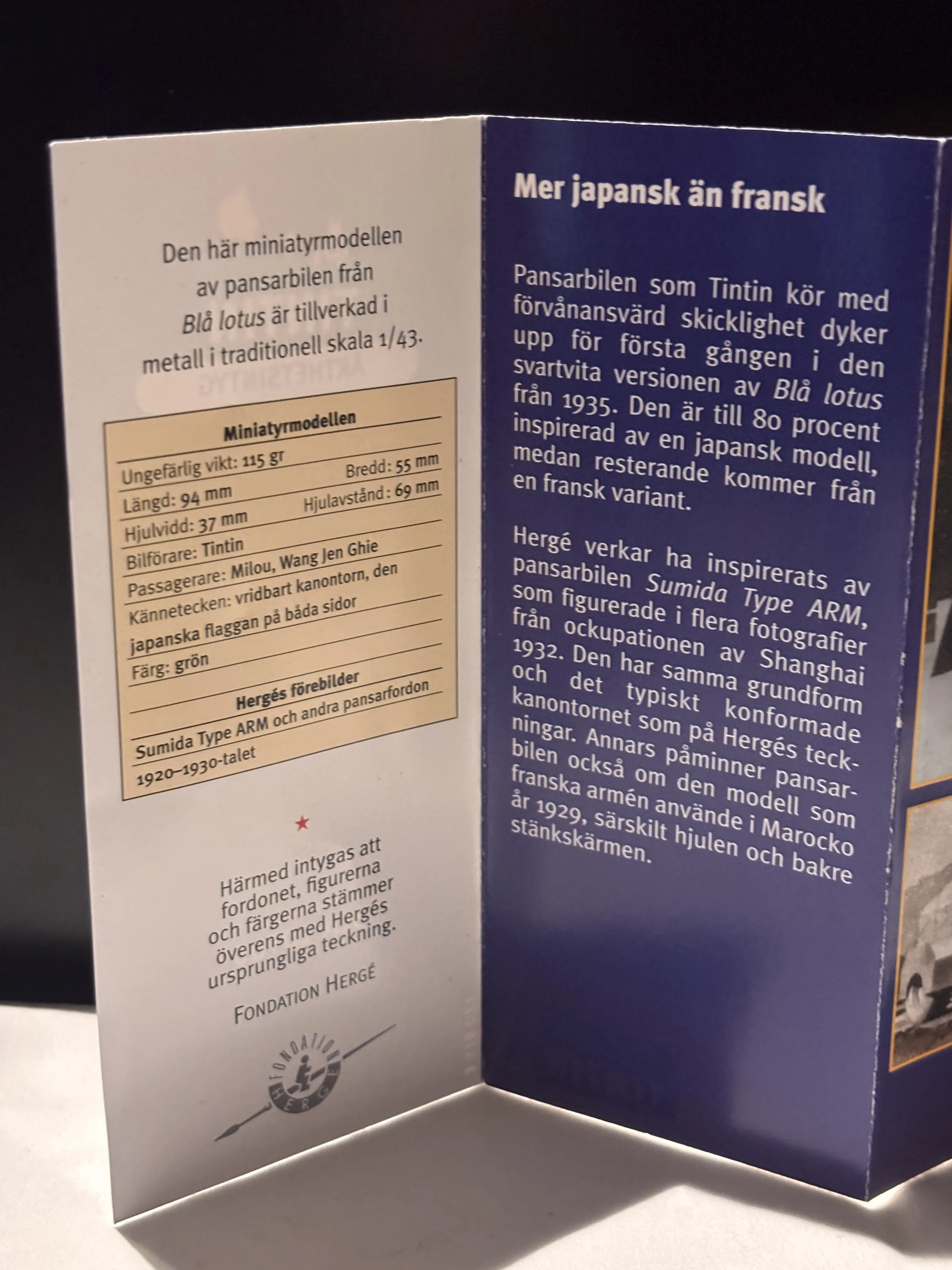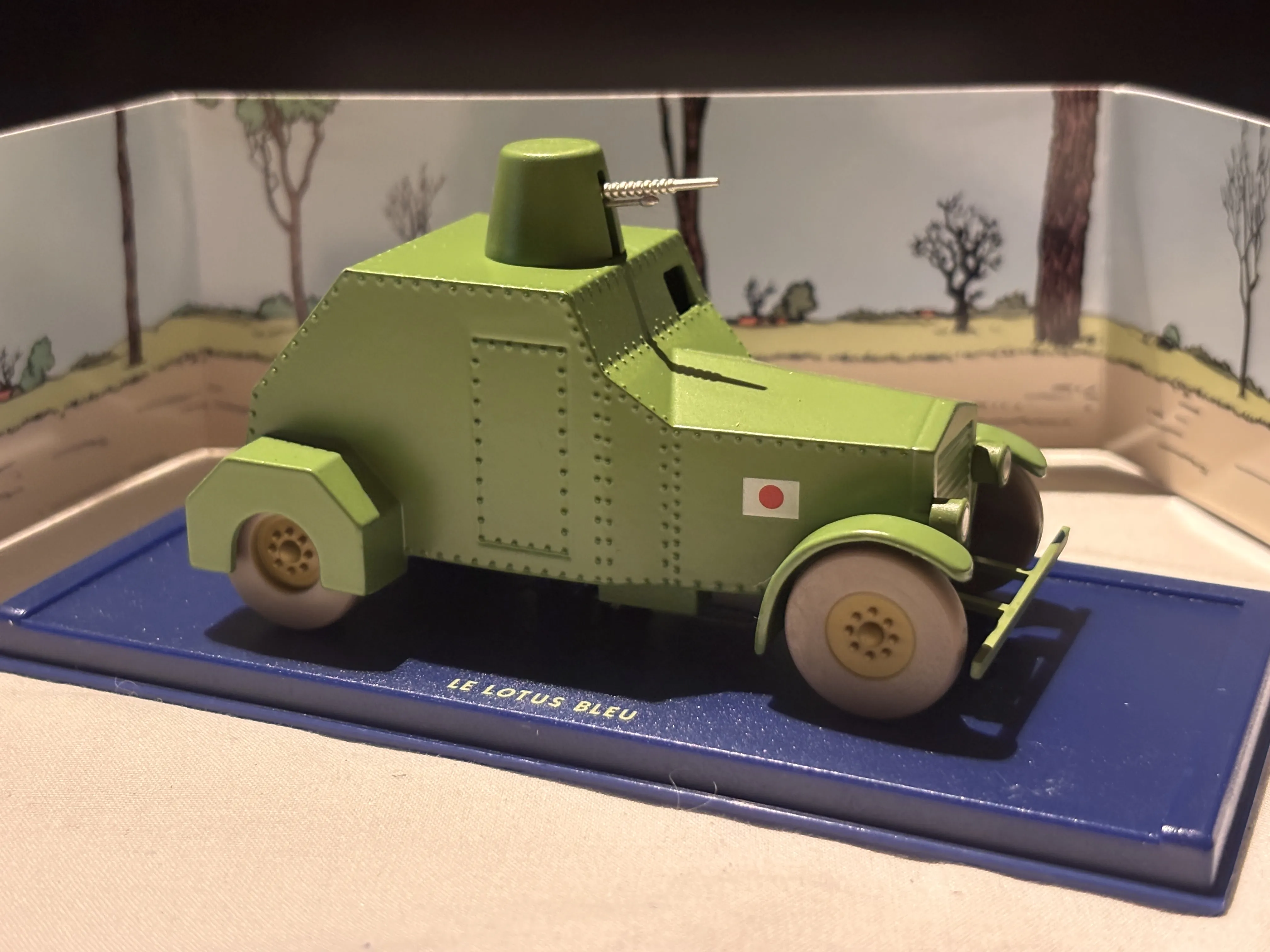 Pansarbil (1920–30-tal) – Från Blå Lotus! Den gröna pansarbil som Tintin kör med imponerande skicklighet. Modellen har detaljer som vridbart kanontorn och japanska flaggor på båda sidor. Inspirerad till största delen av Sumida Type ARM, med inslag från franska pansarfordon.