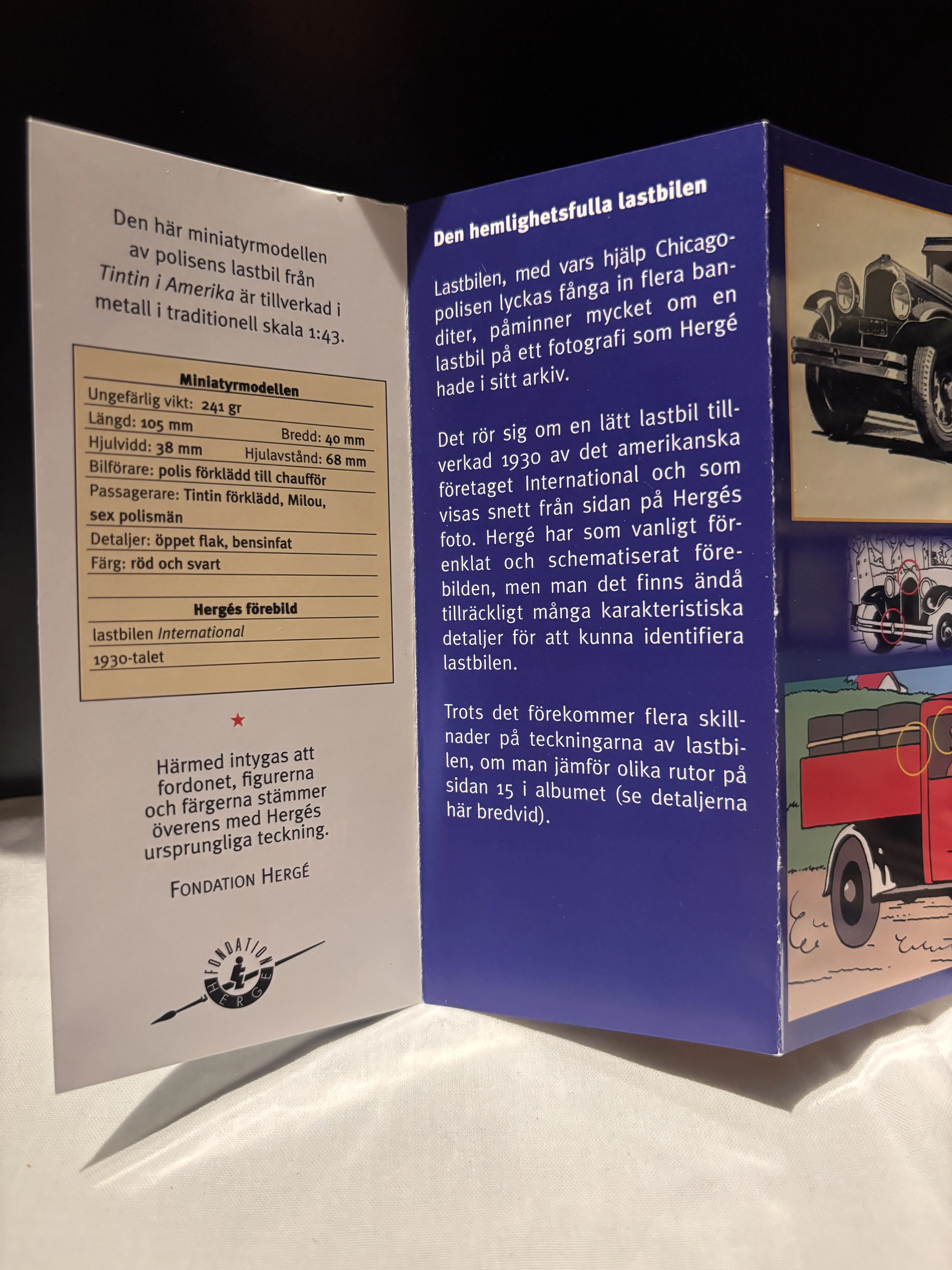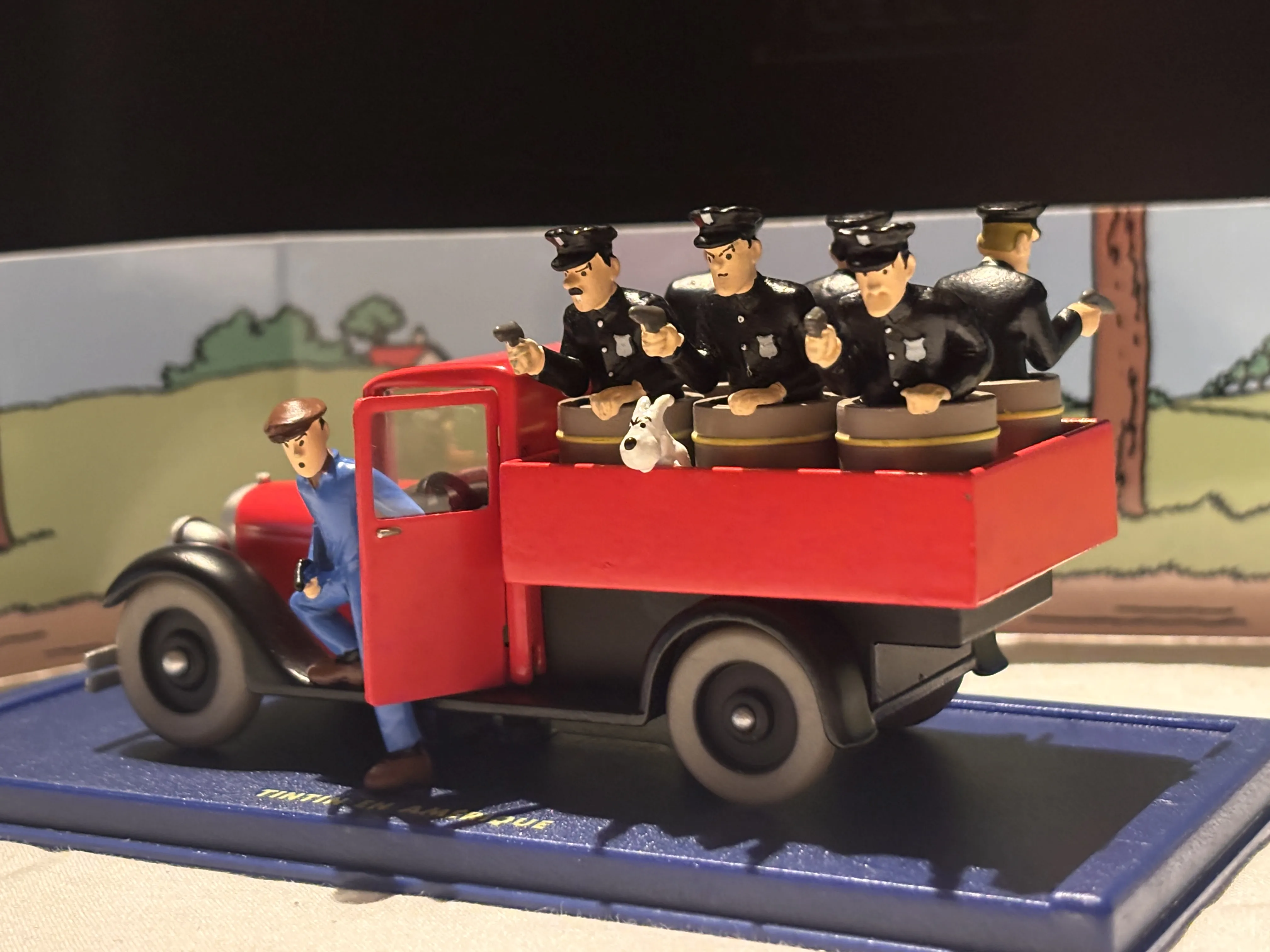 Polisens lastbil (1930-tal) – Från Tintin i Amerika! En röd och svart lastbil från företaget International, här återskapad som den bil där polisen lyckas gripa banditer. Med öppet flak, bensinfat och figurer: Tintin (förklädd), Milou och poliser.