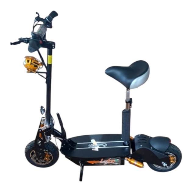 Svartlackerad metall. Utrustad med sadel, skivbromsar fram och bak, stötdämpare samt belysning. Märkt Lyfco 1600W Premium.