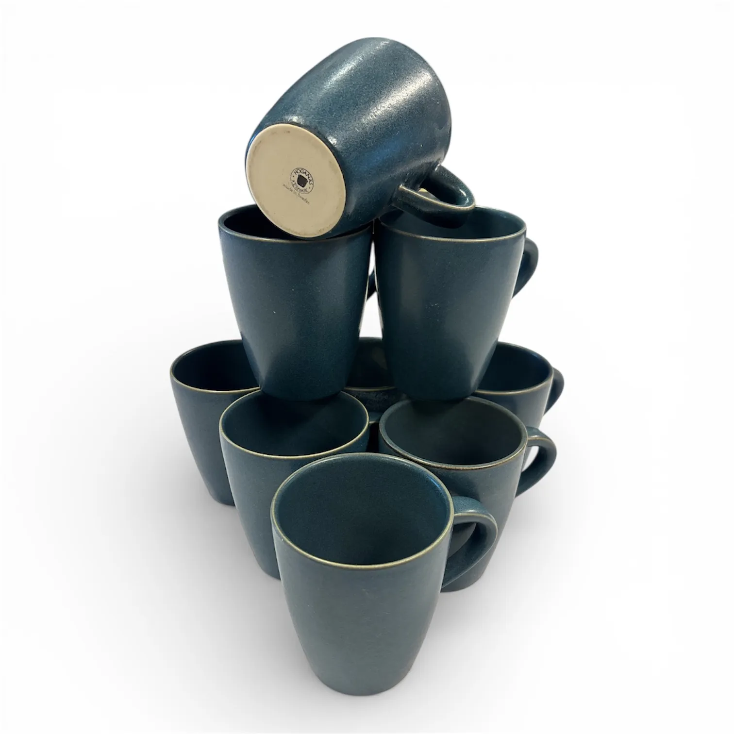 Set med 8 st muggar/koppar i blått stengods. Klassisk konisk form med handtag och matt glasyr. Undertill finns stämpel som tyder på Höganäs Keramik.