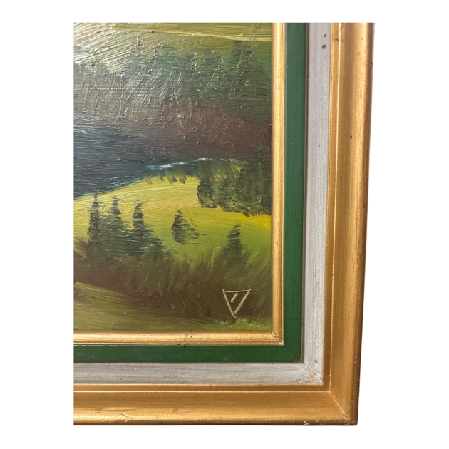 Signerad nere till höger med ett monogram i form av en triangel. Konstnären är okänd, och det är kanske precis därför tavlan fungerar. Inget namn som tar över rummet. Bara motivet, färgen och lugnet.