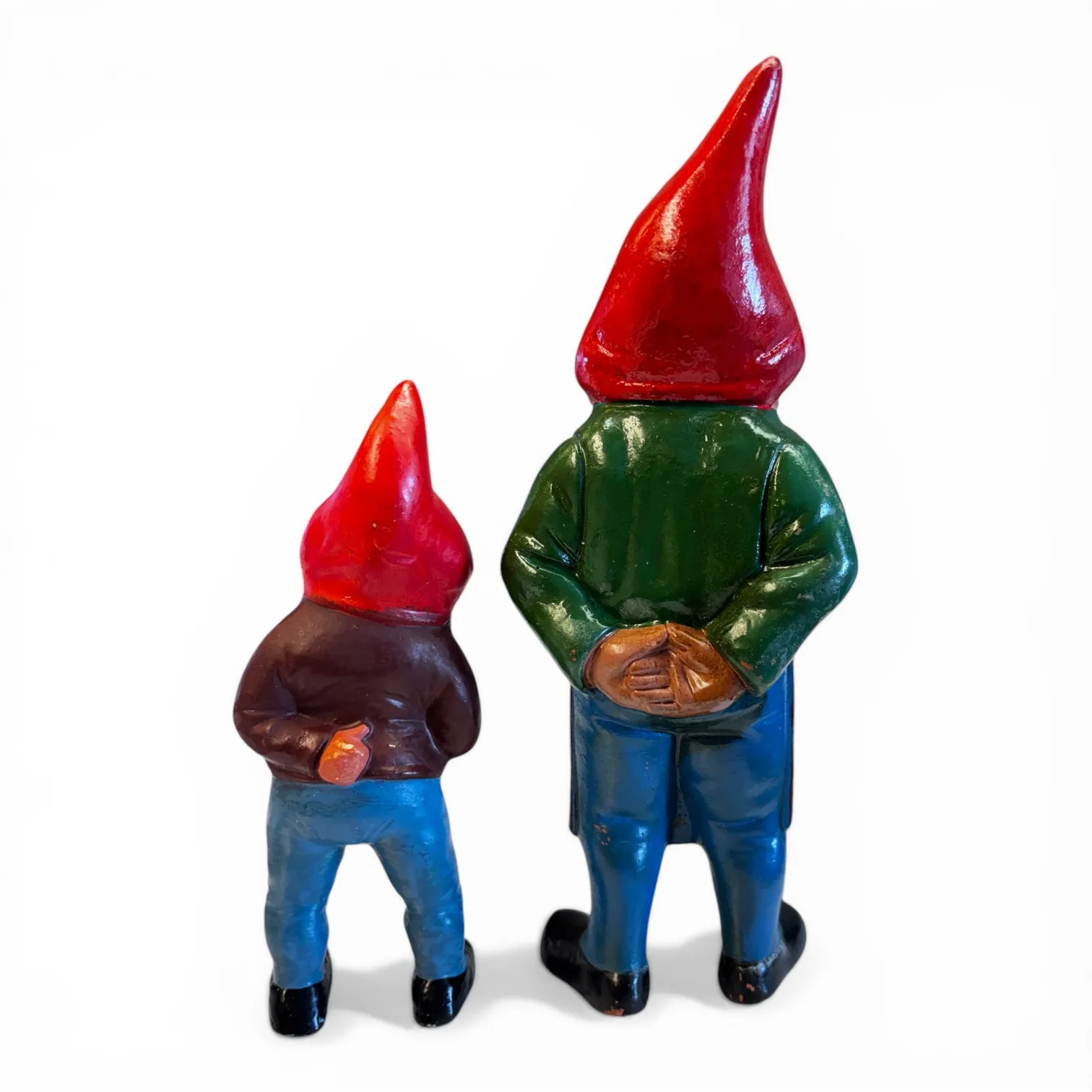 Två mycket charmiga samlarfiguriner föreställande klassiska tomtar i olika storlekar. Figurerna är utförda i traditionellt bemålat lergods (terrakotta) med en delvis glaserad finish. Sannolikt tillverkade i Tyskland (t.ex. Gräfenroda eller Heissner), kända för sitt högkvalitativa hantverk av trädgårds- och jultomtarDesign: Den större tomten bär grön jacka och blå byxor med händerna knäppta på ryggen. Den mindre har en brun jacka och blå byxor. Båda med de karaktäristiska röda luvorna.