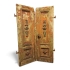 Par äldre dörrblad eller skåpdörrar i massivt trä, rikt profilerade och med bevarad originalpolykromi i slitna jordtoner. Dörrarna är försedda med dekorativa beslag och handtag i metall, troligen ursprungligen avsedda för skåp, altarskåp eller mindre dörrparti.
