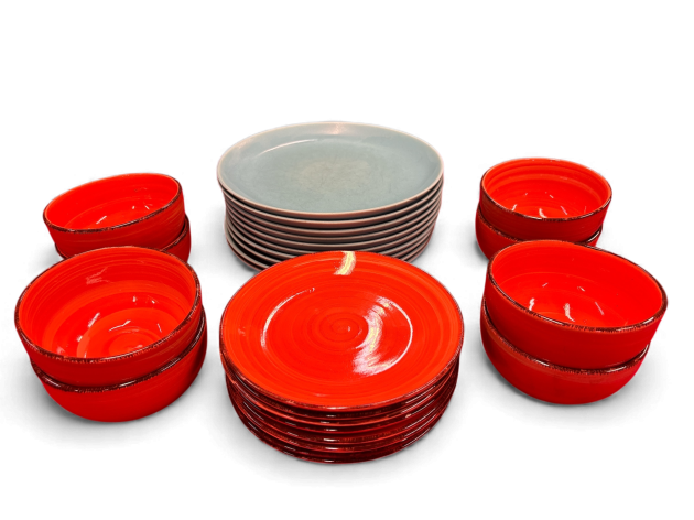 Samlat parti med totalt 16 delar i stengods, med en karakteristisk glaserad finish och handmålade, spiralformade mönster på dom orangea. Servisen kombinerar livfullt orangea och dämpade turkosa nyanser, vilket ger en unik och rustik känsla. Detta är sannolikt en komplett servis för 4 personer (eller delar av en större uppsättning), som kan jämföras med modeller som "Baita" från Villa d'Este Home Tivoli eller "Dubai Light" från Galileo Casa