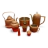 Ett omfattande parti med totalt åtta äldre föremål i koppar och mässing, perfekta för inredning, samlare eller eventuell renovering. Föremålen har en fin, naturlig patina och varierar i storlek och funktionPartiet inkluderarStor kittel/panna: En stor kopparkittel med lyfthandtag, perfekt som dekoration eller vedkärl.Kaffepannor/tekannor: Två mindre kannor med lock och handtag, avsedda för kaffe eller te.Kaffekanna med handtag: En högre, elegant kaffekanna med vinklat handtag.Hink med lejonhuvuden: En rund hink eller cache-pot med dekorativa lejonhuvuden i mässing och ringhandtag, möjligen avsedd som kolsäck eller planteringskärl.Mindre kärl: Ett mindre kärl med två handtag, en liten miniatyrkanna med lock, samt ett avlångt rör/kärl