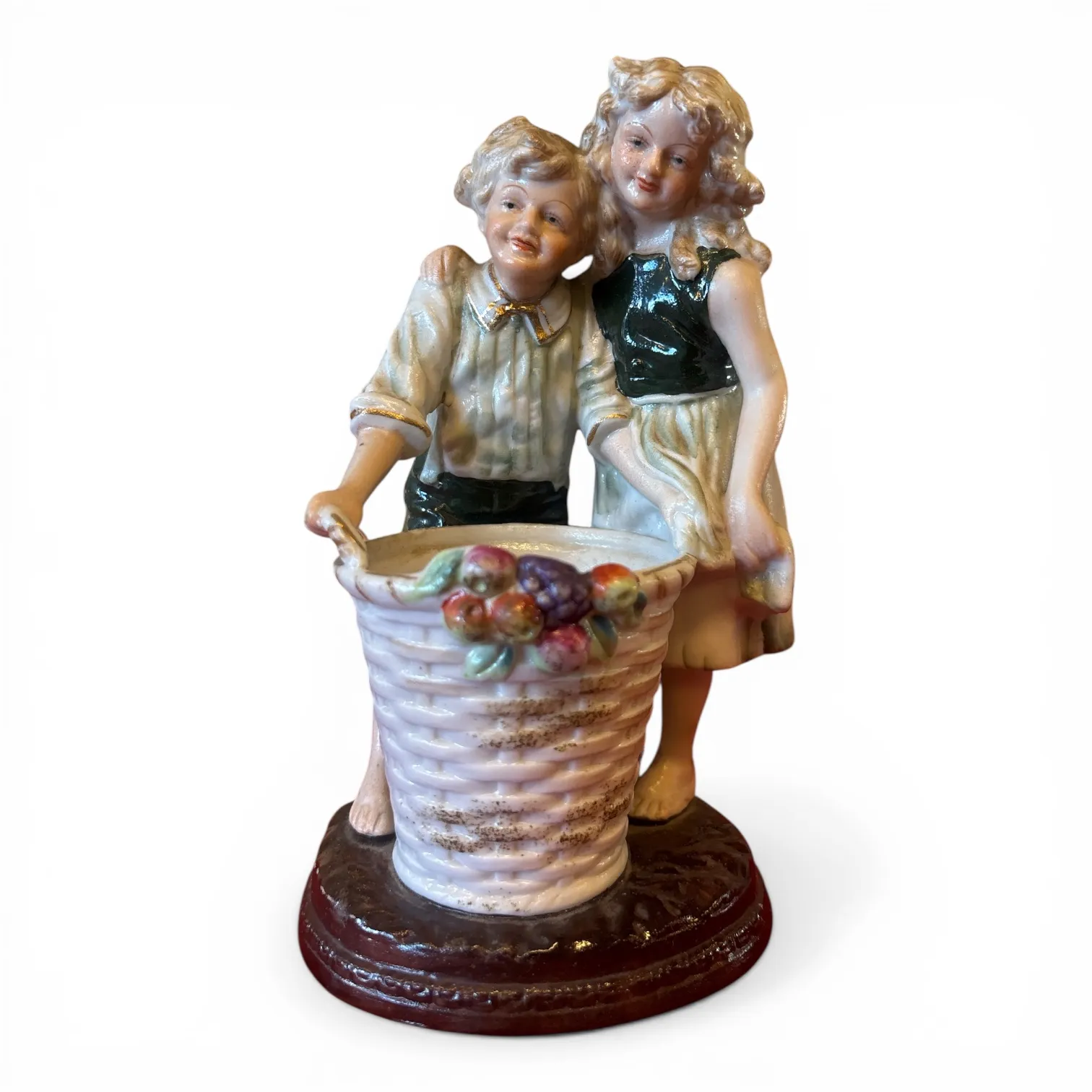 Charmig porslinsfigur föreställande två barn stående vid en korg med fruktdekor. Figuren har fina detaljer i ansikten, kläder och glasyr och fungerar även som mindre ytterfoder/kruka.