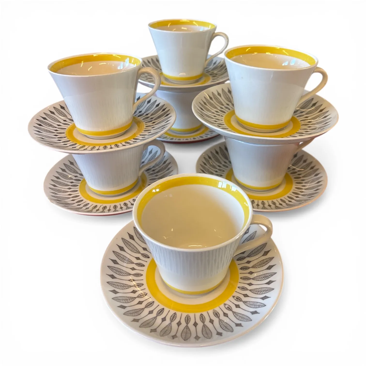 Vitglaserat porslin med dekor i gult och gråsvart i tidstypisk 1950/60-talsstil.