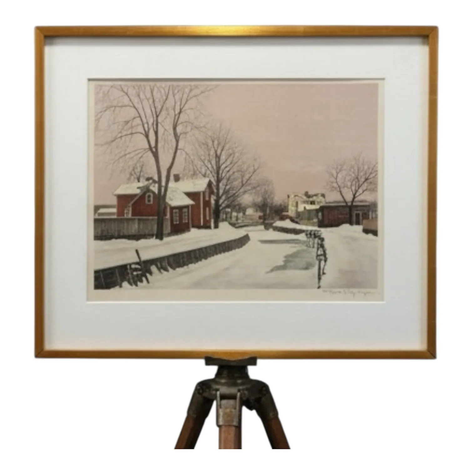 Stämningsfull litografi av Reinhold Ljunggren (1915–2006) med titeln “Sunday Morning by the River, Trosa”. Motivet visar en stilla vintermorgon i den idylliska staden Trosa, med de karakteristiska röda trähusen, vattendraget och den mjukt rosa himlen som speglar Ljunggrens känsla för ljus och småstadsromantik.