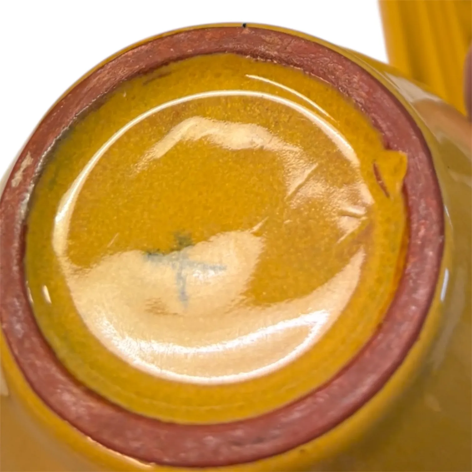 En mycket vacker och tidstypisk klotvas i glaserat lergods, sannolikt från Laholm Keramik. Vasen har en djup och lysterfull bärnstensgul glasyr och en klassisk, harmonisk form. I botten finns ett handmålat kryss/markering, vilket är karaktäristiskt för de hantverksmässiga metoderna vid de svenska lergodsverkstäderna under mitten av 1900-talet