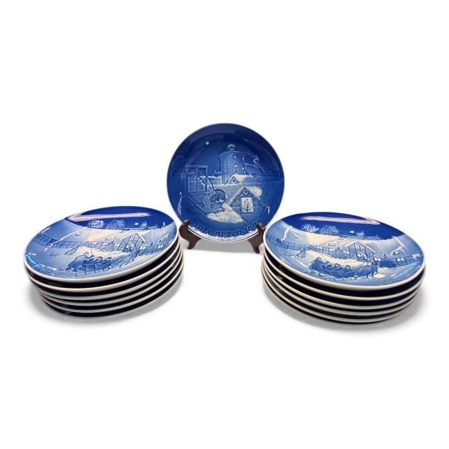 Samling med blåvita jultallrikar från Royal Copenhagen, Danmark.