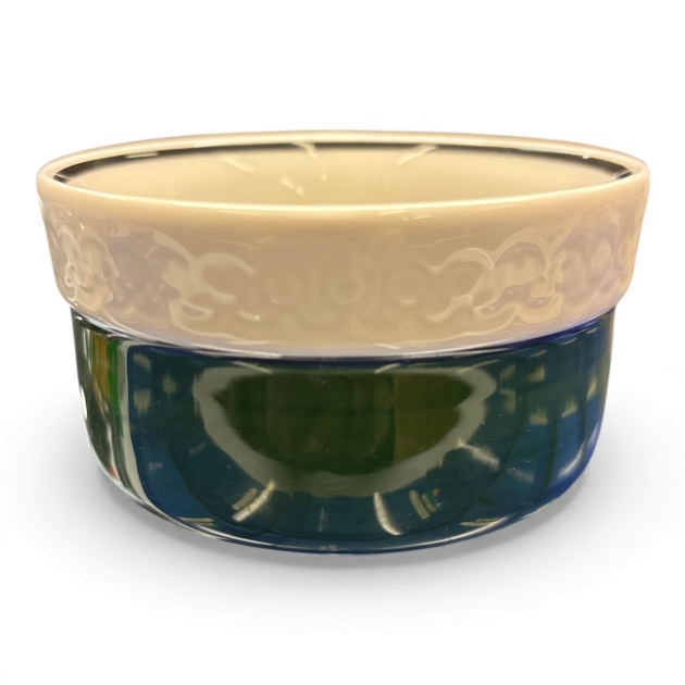Vacker vintage-skål från Rörstrand, ur serien Taffel. Skålen har en dekorativ tvådelad design med blå/grön transparent glasyr på underdelen och en ljusare, mönstrad kant upptill. Kombinationen av färger och reliefdekor ger ett stilfullt och tidstypiskt uttryck som är typiskt för Rörstrands formgivning under mitten av 1900-talet.