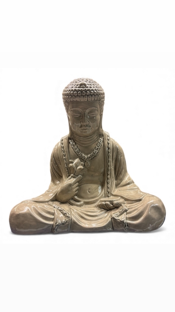 Elegant sittande Buddhaskulptur i glaserad keramik. Figuren är avbildad i klassisk meditationspose med korslagda ben och ett fridfullt ansiktsuttryck. Buddha håller en lotusliknande blomma i höger hand – en symbol för renhet och upplysning – medan vänster hand vilar öppet i en gest av givmildhet. Skulpturen är rikt modellerad med detaljerade draperingar och dekorativ halskedja, och ytan har en jämn, högblank glasyr i varm beige ton. Ett dekorativt och harmoniskt objekt som passar både som inredningsdetalj och samlarföremål.