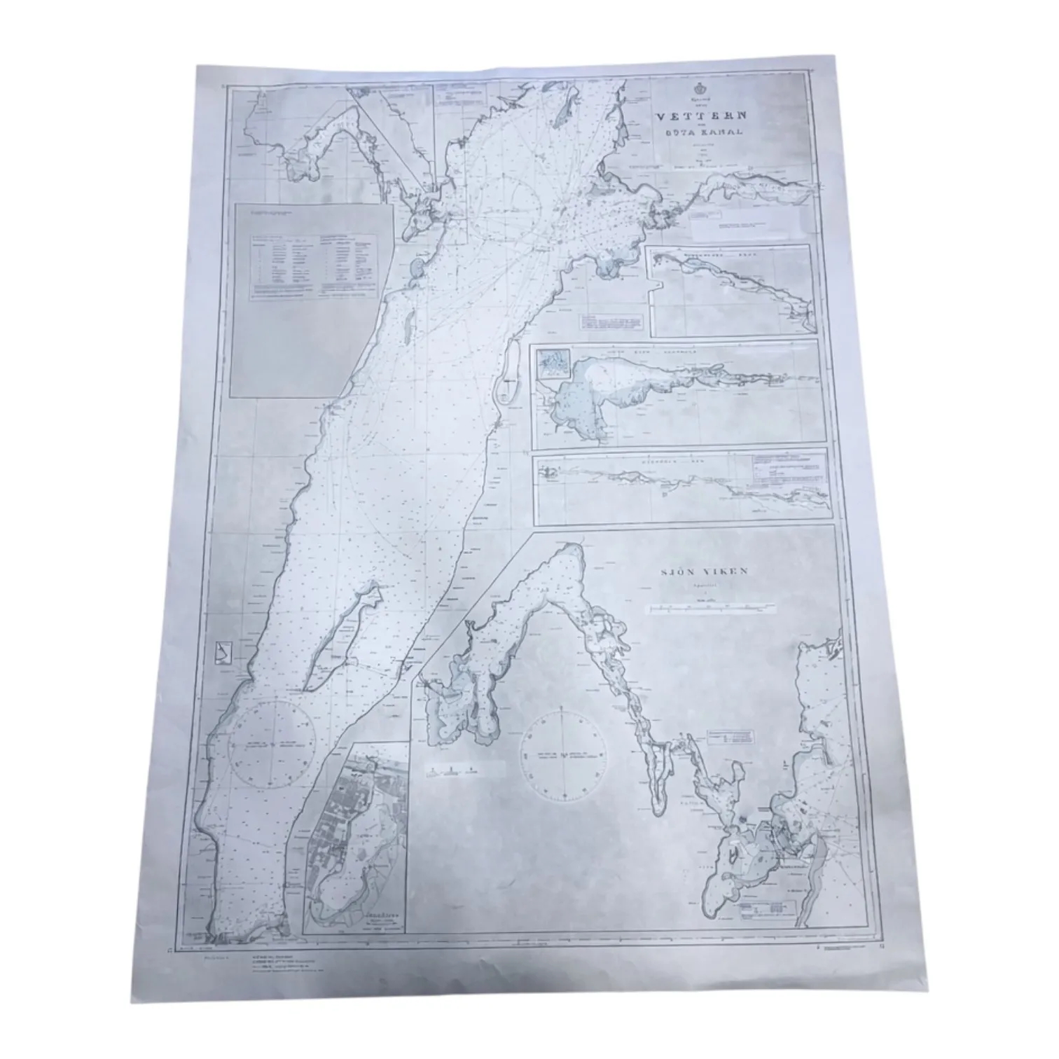 Sjökarta över Vättern samt delar av Göta kanal. Tryckt karta med detaljerade djupangivelser, farleder och hamnar. Med flera infällda delkartor över specifika områden.
