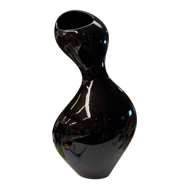 Skulptural och uttrycksfull vas i keramik, utförd i en organisk, asymmetrisk form med mjukt böljande linjer. Den djupt svarta, högblanka glasyren förstärker vasens sensuella silhuett och ger ett starkt visuellt djup med speglande yta.