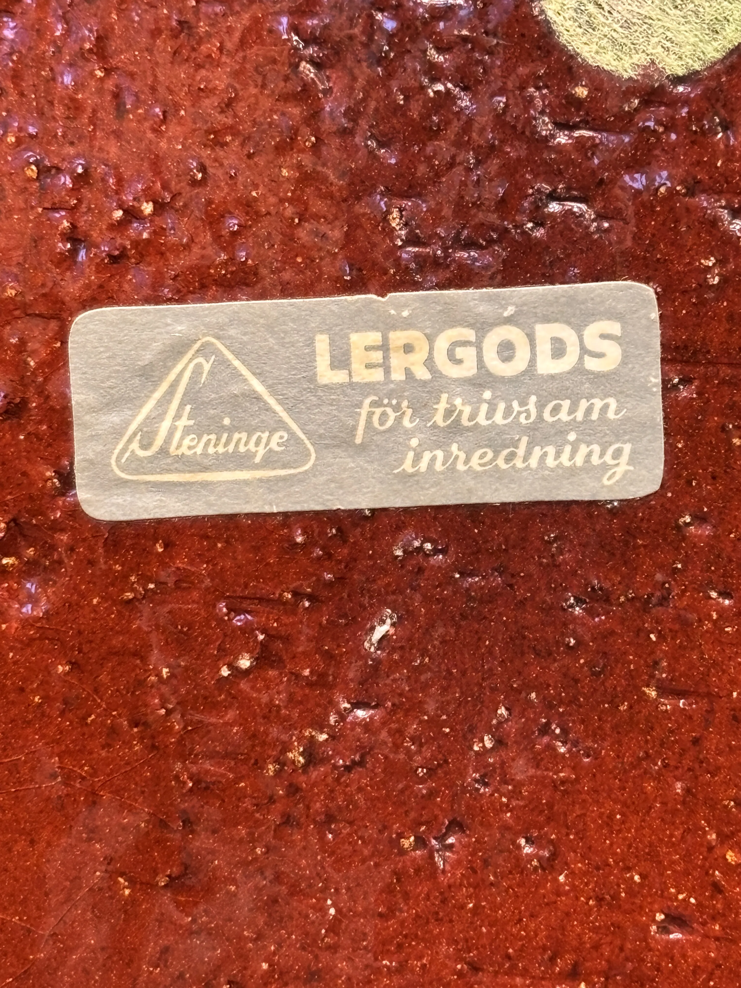 Märkt undertill med modellnummer 32 samt stämpel RVF, och bevarad originaletikett: “Steninge – Lergods för trivsam inredning”.