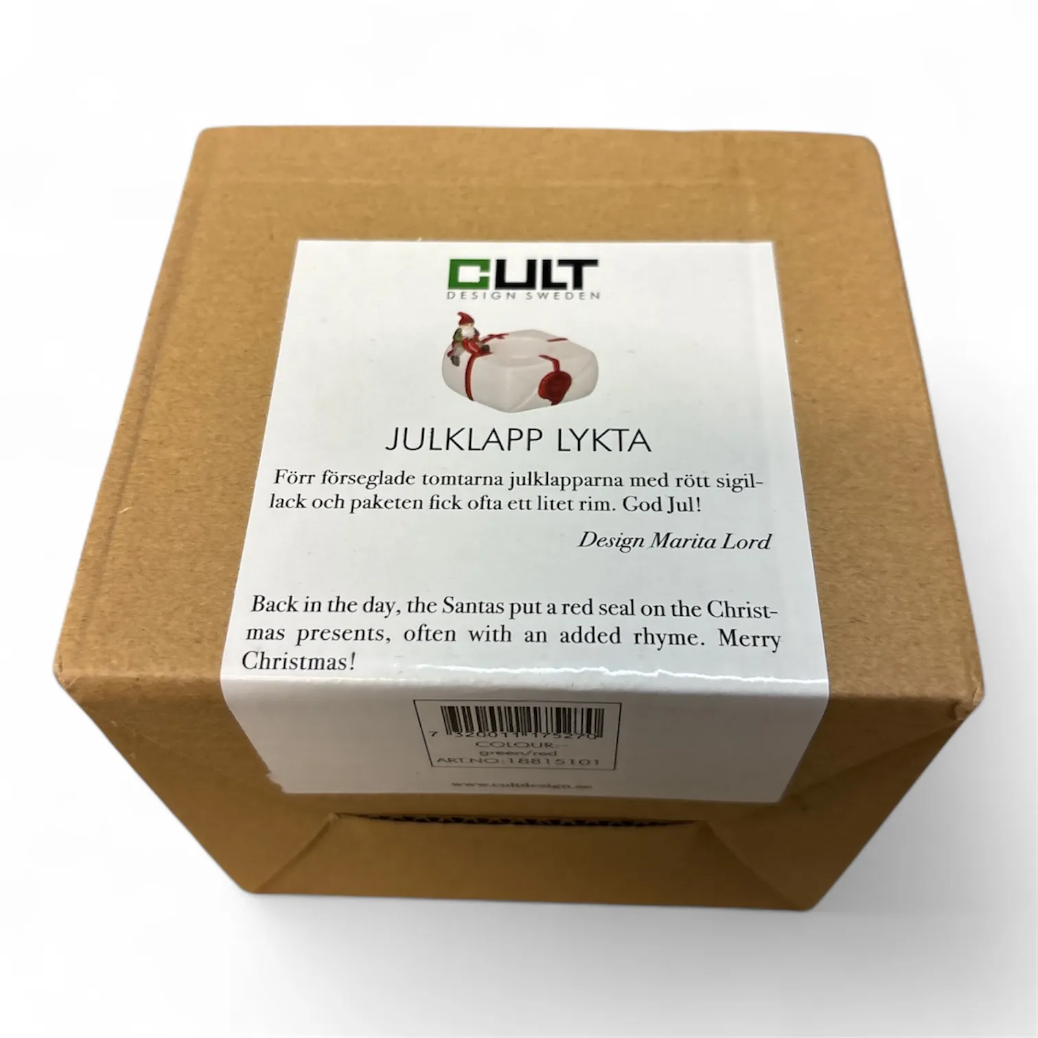 Cult Design “Julklapp Lyktа”, design Marita Lord – i originalförpackning, en charmig porslinslykta i form av ett inslaget paket.
