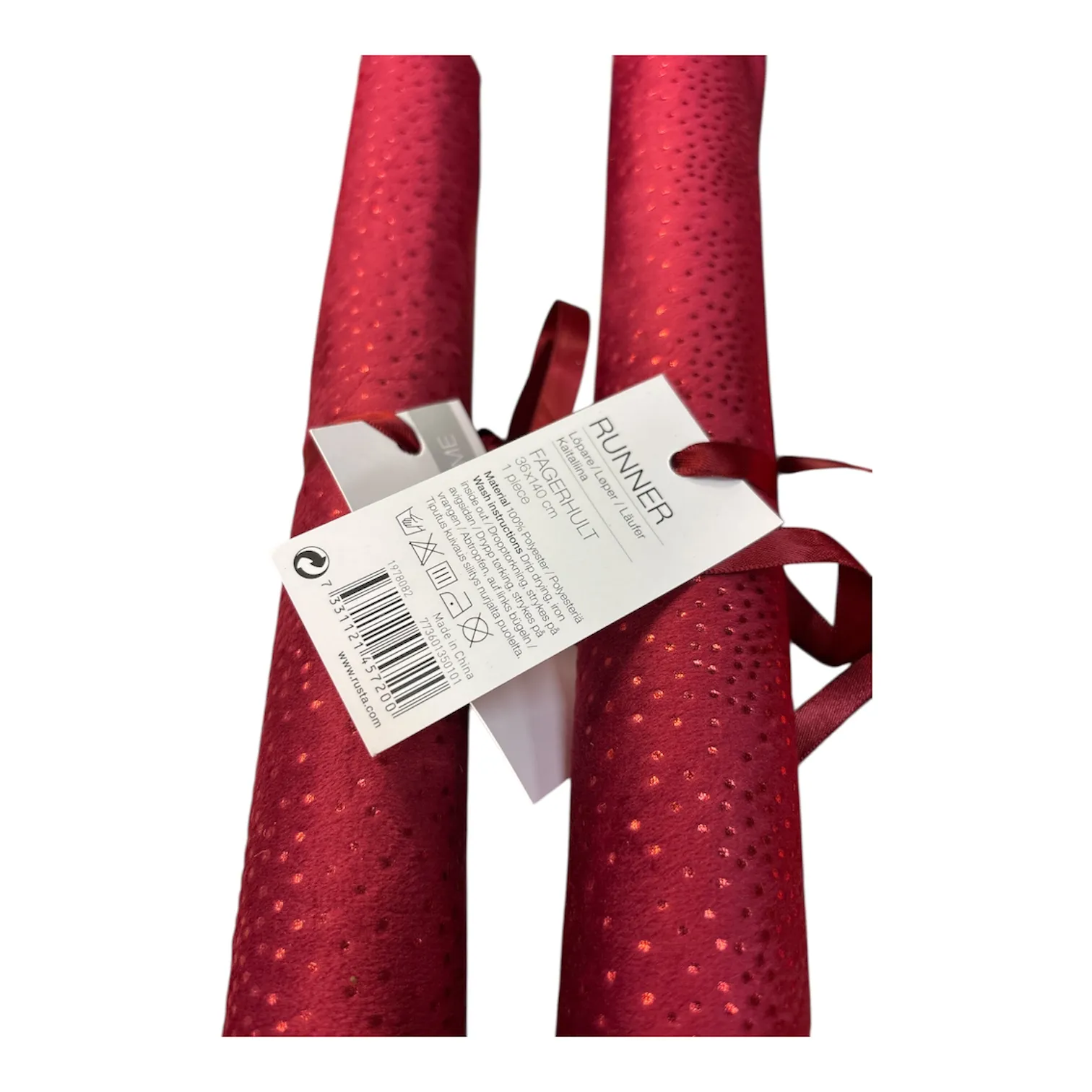 Två röda bordslöpare “Fagerhult” (40x140 cm) med diskret mönster och elegant glans.