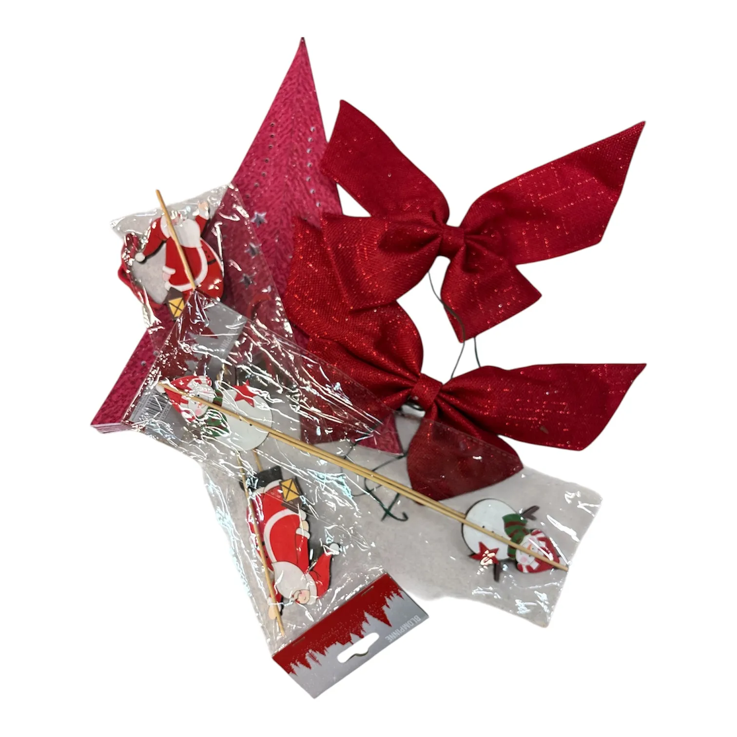 Röda rosetter och dekorationer för gran, dörrkrans eller paket.