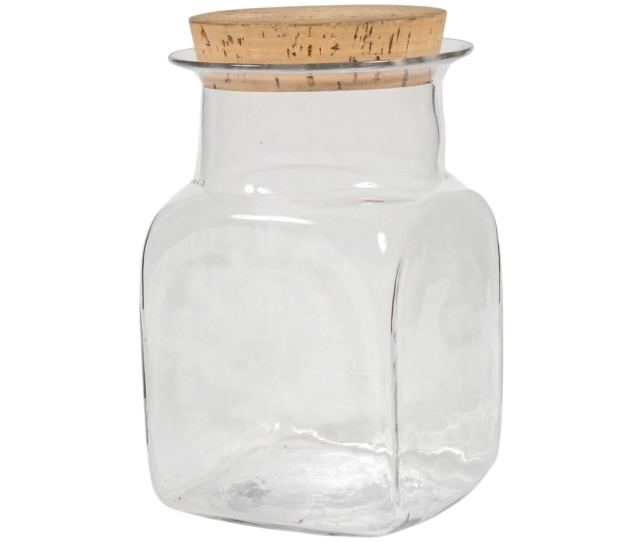 Stor glasburk med tillhörande korklock, formgiven av Signe Persson-Melin. Burken har en generös storlek och en enkel, funktionell form med mjukt rundade hörn och lätt utställd mynning. Kombinationen av klart glas och naturkork skapar ett harmoniskt möte mellan industriell precision och organiskt material.