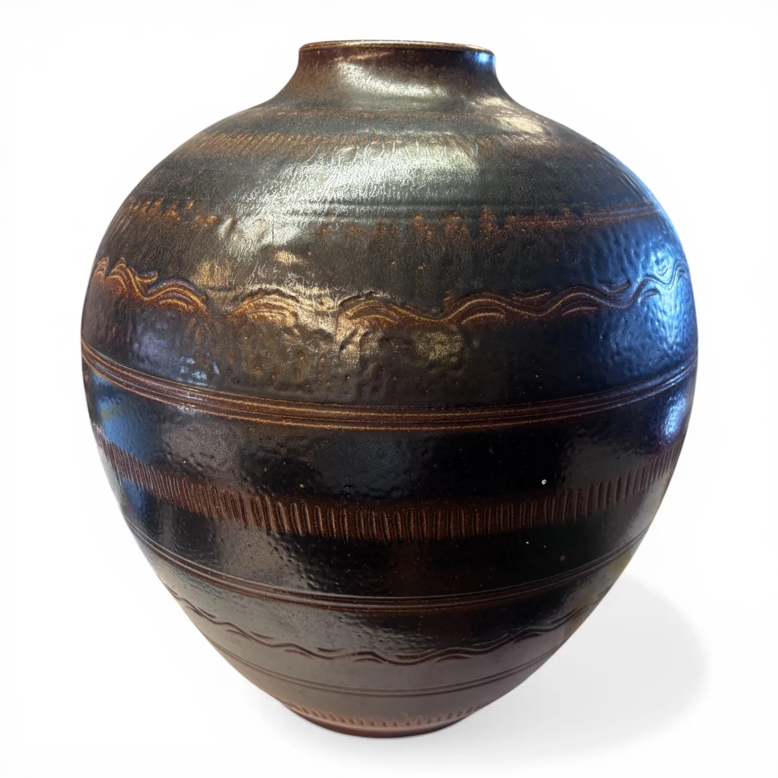 Krukans kraftfulla, rundade form kombineras med en djup, levande glasyr i mörkbruna till svarta toner med metallisk lyster. Dekoren består av klassiska horisontella band och vågformade mönster – ett tydligt kännetecken för Vallåkras rustika och tidlösa formspråk.