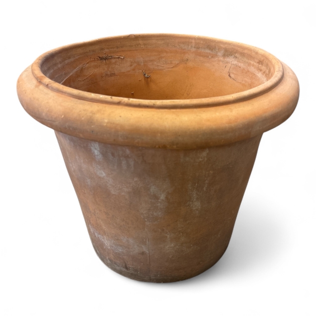 Vacker och rejäl terracottakruka i klassisk form med rundad kant upptill.