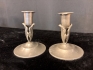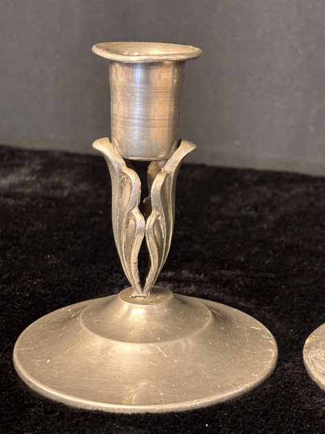 Elegant par ljusstakar i tenn från Svenskt Tenn, märkta “Svenskt Tenn – Handarbete – 118”.