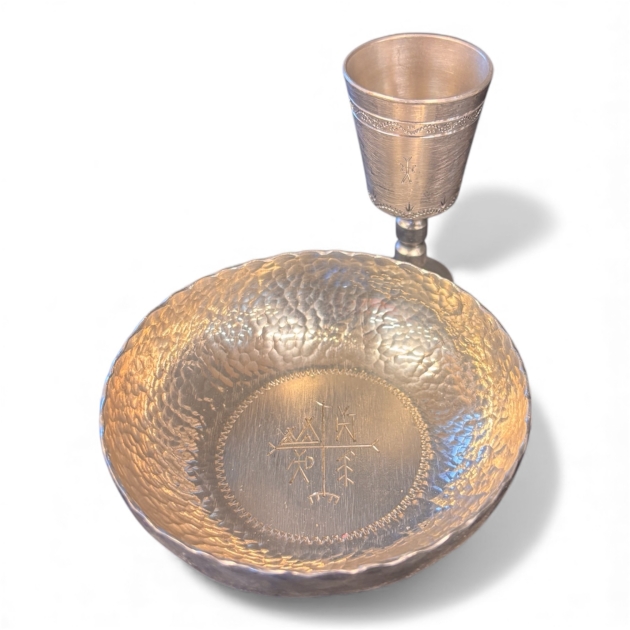 Vackert set i handarbetat tenn, bestående av en bägare och en skål, båda med hamrad yta och graverad samisk dekor.