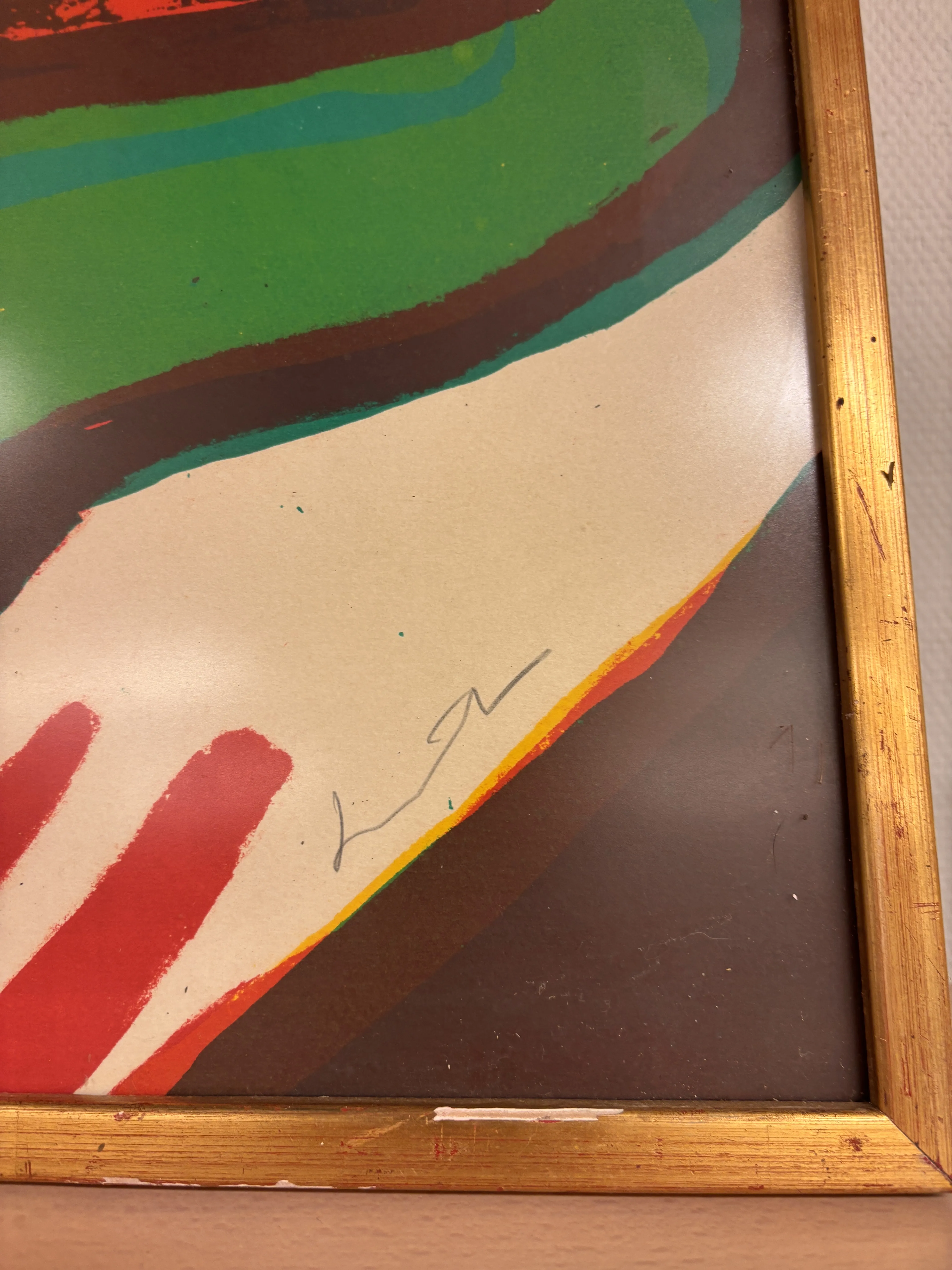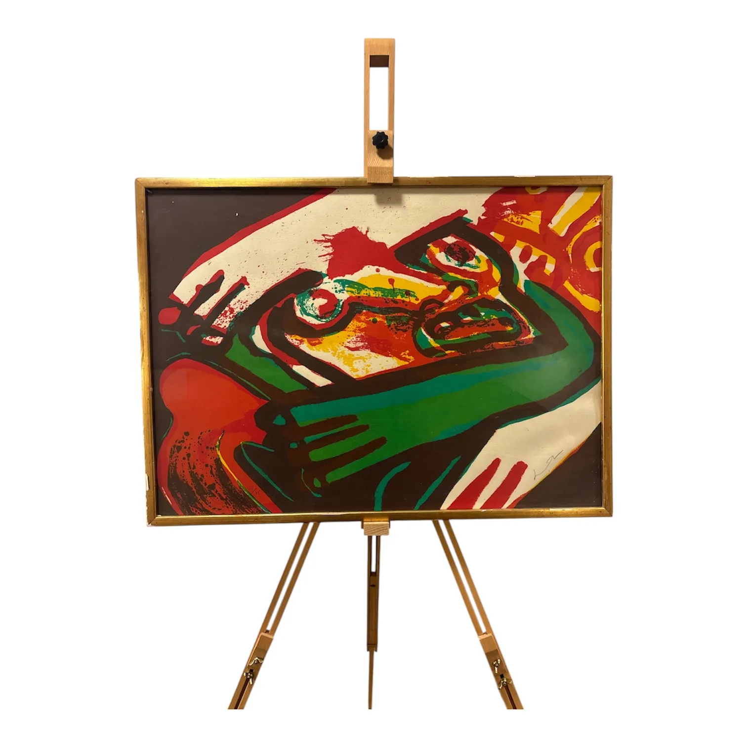 Färgstark abstrakt tavla med kraftfullt uttryck och tydligt formspråk i rött, grönt, gult och svart. Motivet och färgbehandlingen är typiska för Bengt Lindströms stil, med det karaktäristiska ansikts-/maskliknande uttrycket.