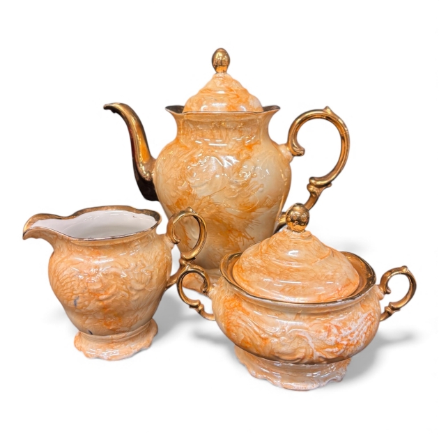 Består av tekanna, sockerskål med lock och gräddkanna – alla i elegant marmorering i orange och vitt, med handmålad gulddetaljering på kanter och handtag.