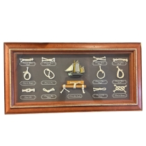 Dekorativ maritim väggtavla med flera klassiska sjömansknopar monterade i ram tillsammans med en liten modell av en segelbåt i mitten. Knoparna är gjorda i rep och varje knop har en liten skylt med namn på franska, exempelvis Noeud de Cabestan, Noeud de Chaise och andra traditionella knopar som används inom sjöfart och segling.