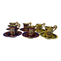 Kopparna är rikt dekorerade i olika färger – bland annat blått, rött och gult – med guldfärgade detaljer och klassiska motiv i medaljong på kopparnas framsida. Handtagen är dekorativt formade och även de guldfärgade.