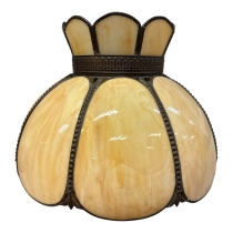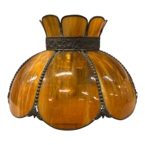 Dekorativ taklampa i Tiffany-stil med segmenterade glas fält i marmorerat glas i varm beige/amber ton. Glasdelarna är infattade i en dekorativ metallram vilket ger lampan ett klassiskt och elegant utseende.