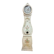 Dekorativ golvklocka i Moraklockestil med handmålad blomdekor och ljus bemålning. Klockan har klassisk svensk allmogeform med rund urtavla och svängt skåp.