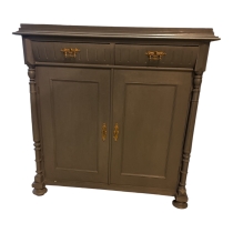 Äldre skänk / sideboard i klassisk stil med två lådor upptill och dubbla skåpdörrar nedtill. Möbeln har dekorativa svarvade sidokolonner och vackra mässingsbeslag med nyckelhålsskyltar och handtag i äldre stil.