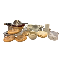 Större blandat parti med diverse köks- och hushållsartiklar i olika material såsom glas, keramik, metall och plast. Perfekt för köket, hobbykocken