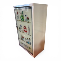 Tillverkat i metall med glas/spegel framtill. Inuti finns hyllplan för förvaring. Perfekt som badrumsskåp eller dekorativ inredningsdetalj i retrostil.