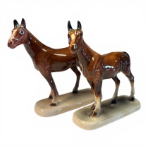 Två porslinsfigurer föreställande hästar på ovala baser. Märkta undertill med grön stämpel samt modellnummer.