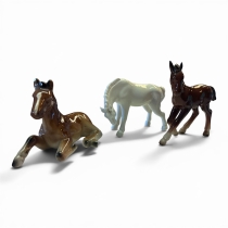 Tre mindre porslinsfigurer föreställande hästar i olika utföranden.